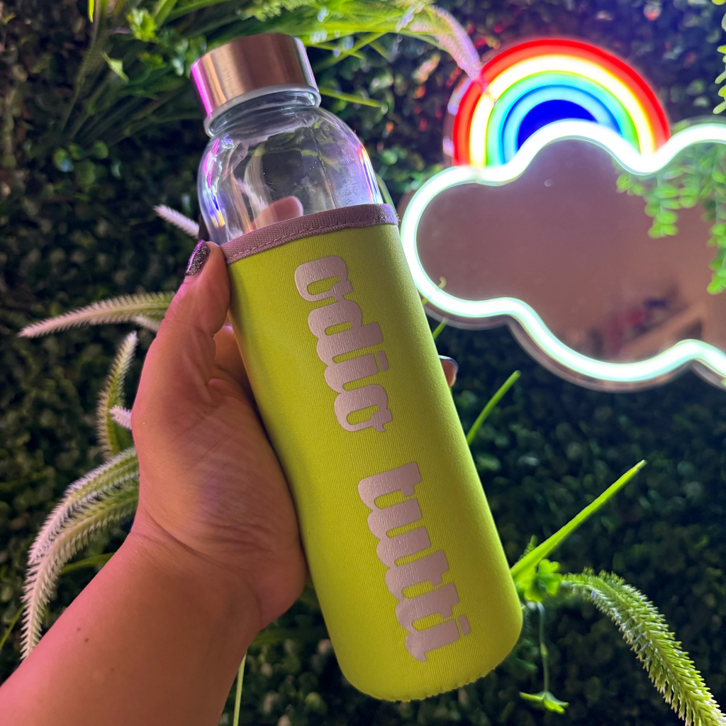 amo questa è una borraccia pezzo unico in vetro con protezione in stoffa, molto carica da portare in palestra, ufficio, per lanciarla addosso a qualcuno.